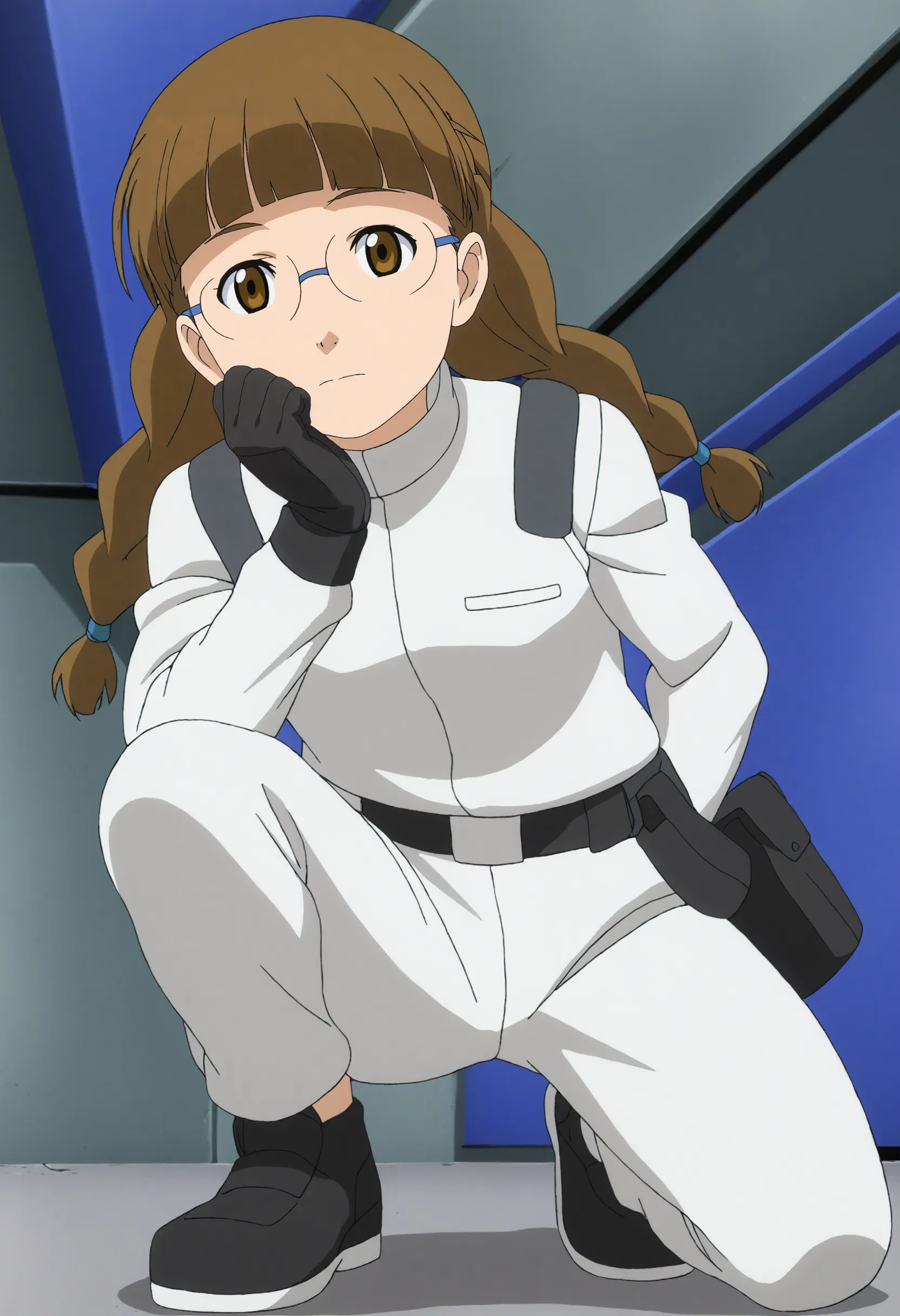 Image description: A young woman with brown eyes, and long, light brown hair styled in two braided pigtails. She wears a white, jumpsuit with a high collar and a small chest pocket. Her outfit is complemented by black gloves, black with white soles, and a pair of small black bags attached to her belt. She is crouching on one knee, with her other knee bent and her elbow resting on her thigh. The background features a sterile, metallic environment with blue and gray tones.