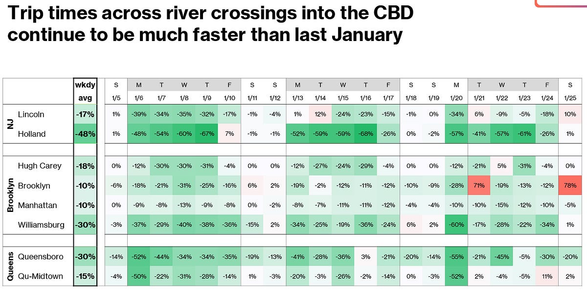 In the first month of congestion pricing, the MTA reported over 1 million fewer vehicle entries into the toll zone than would be expected without the program, driving the significant traffic reduction seen above. It’s also worth noting that the above chart shows reduction in travel times rather than congestion—in many cases, congestion has completely disappeared, and the new travel times represent a congestion-free trip. This reduction reverses a years-long trend of rising traffic into Manhattan - congestion pricing took a worsening gridlock problem and solved a significant portion of it overnight. Additionally, while there were fears that congestion pricing would just re-route traffic to other boroughs, the data from the first months of congestion pricing suggests that traffic has not increased elsewhere in the city.