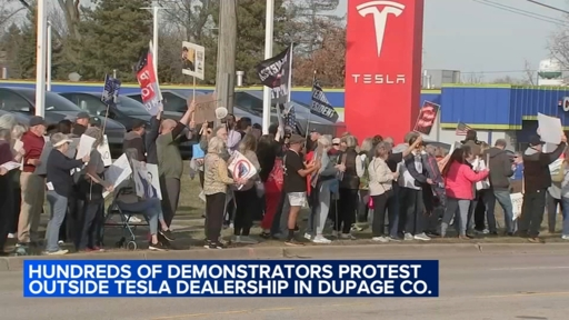 Group holds 'Tesla takedown' rally outside Lisle dealership, protesting Elon Musk's DOGE