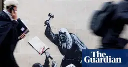 A painting by Banksy of a judge using a gavel to beat a helpless protester appeared on the walls of the Royal Courts of Justice before quickly being covered up by guards.