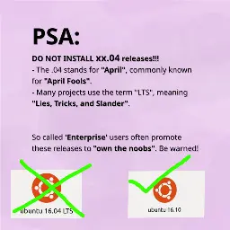 - Many projects use the term "LTS", meaning "Lies, Tricks, and Slander". So called 'Enterprise' users often promote these releases to "own the noobs". Be warned!