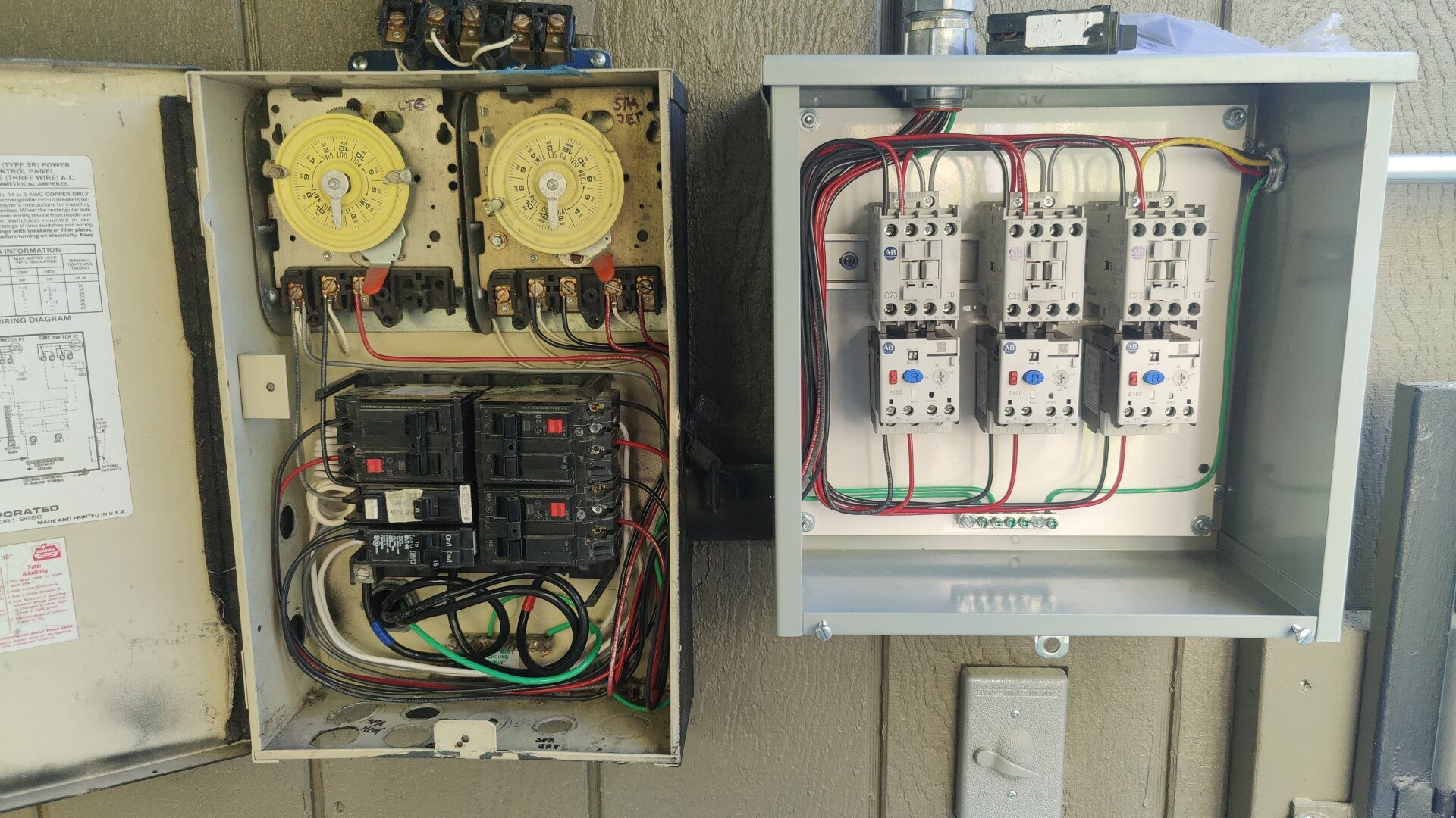Used existing pool panel on left, added contactor box on right. Left two contactors control pool and spa circ pumps and always on (no variable speed or hi/low legs on motor), coil controlled by emergency shutoff. Right contactor controls spa jet pump, activated by twist timer and same emergency shutoff. Spa jets are run through the right time clock to allow usage from 7am to 10pm. Left time clock is for lighting.